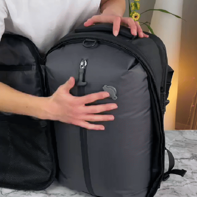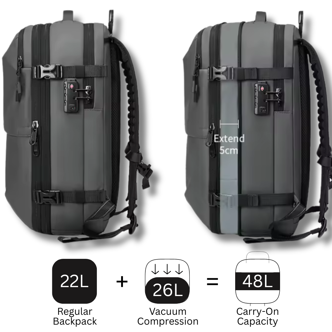 Packs like a suitcase, carries like a backpack. Start with 22 liters of compact storage and expand to 48 liters when needed. The built-in vacuum system unlocks up to 26 liters of extra space, so you can pack more without the bulk.