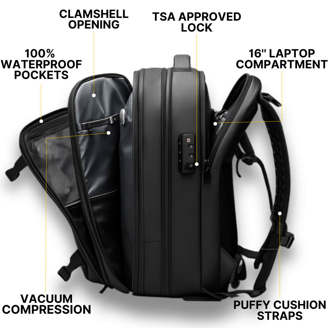 Vackspace keeps your essentials in order with a 16-inch laptop compartment, waterproof pockets, vacuum compression zone, and a clamshell opening for quick access. The TSA-approved lock adds peace of mind, while padded straps keep every trip comfortable and secure.